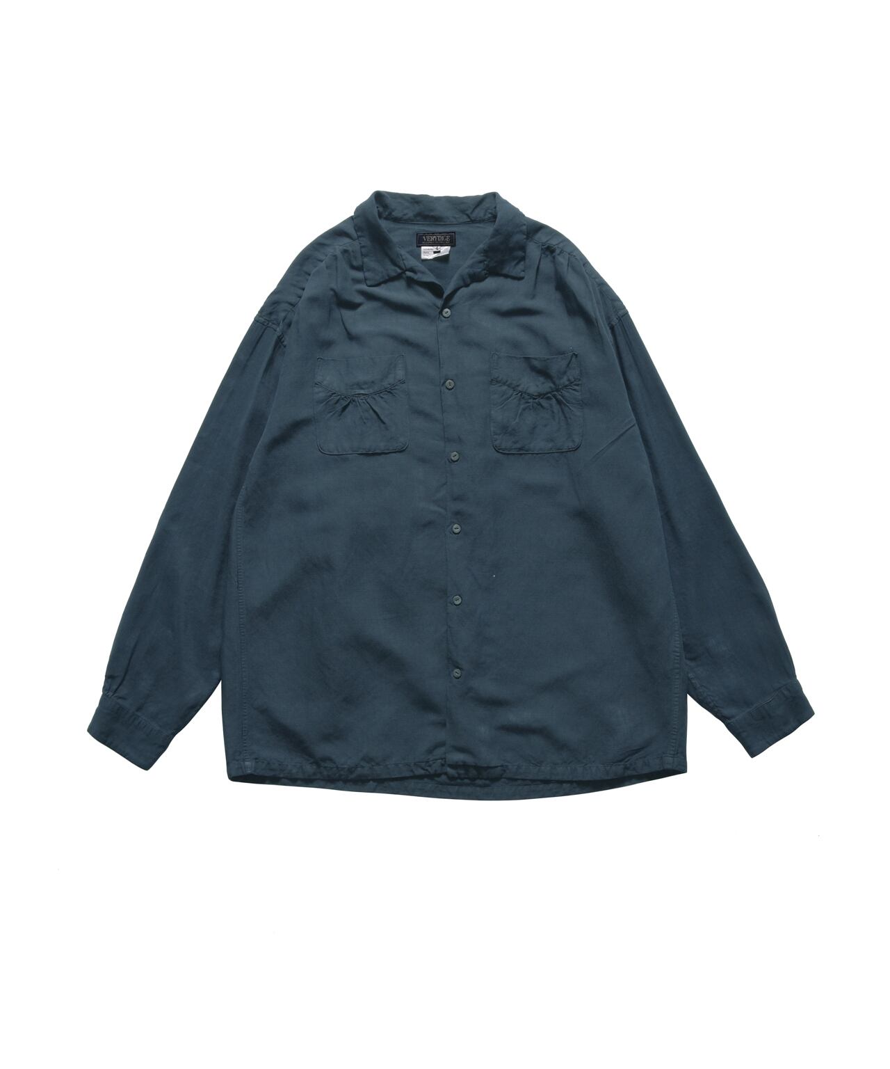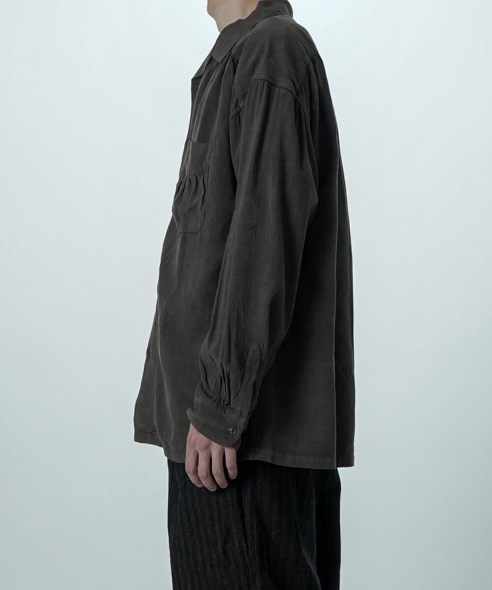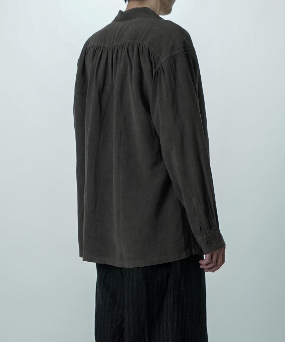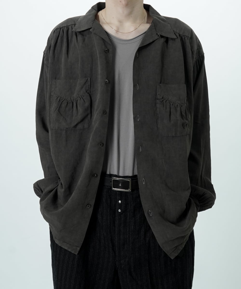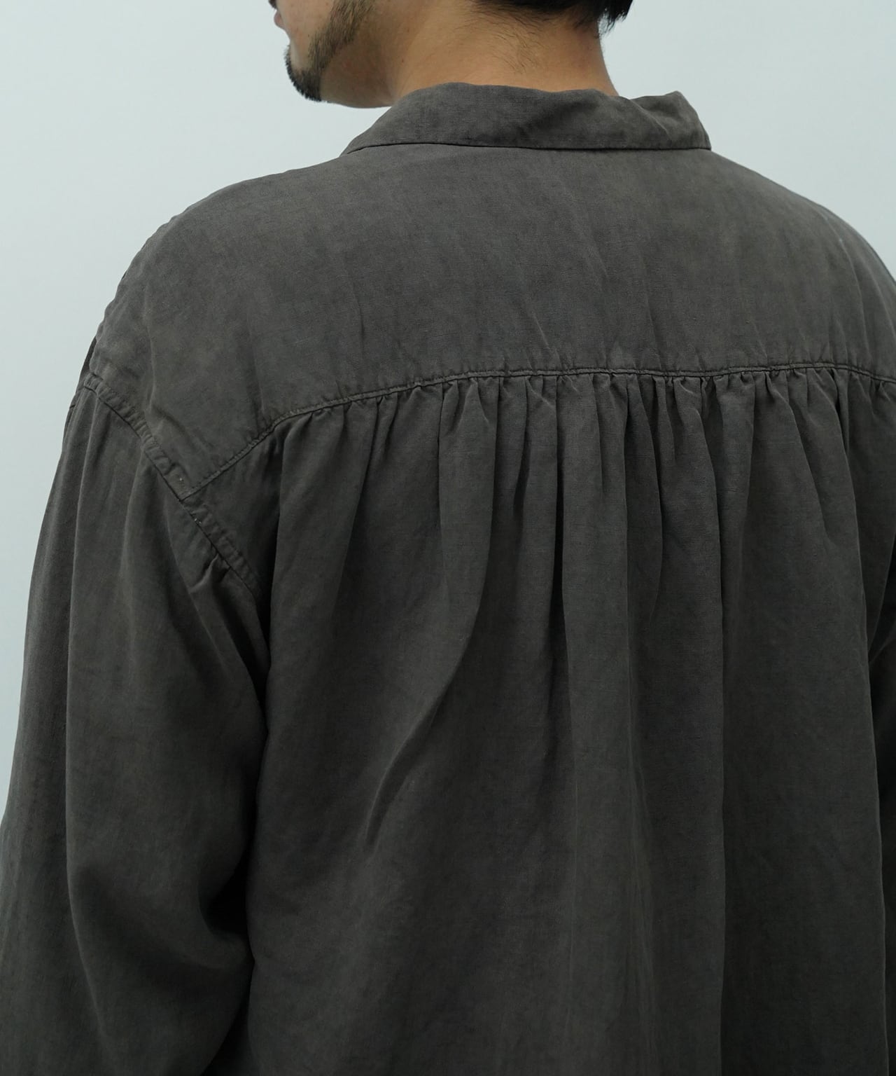 反応染めで染め上げた後にピグメントブラックで更に染め、最終的にバイオ加工を施す事でギャザーをダーティーに仕上げています。