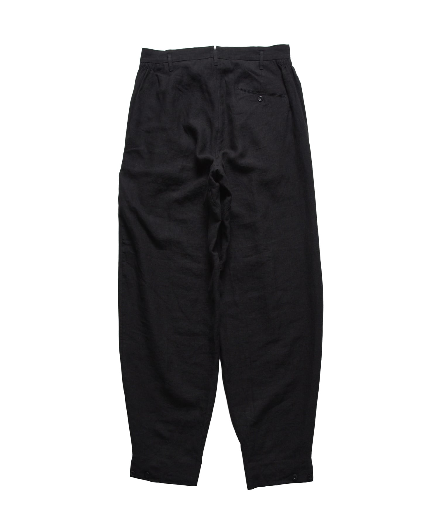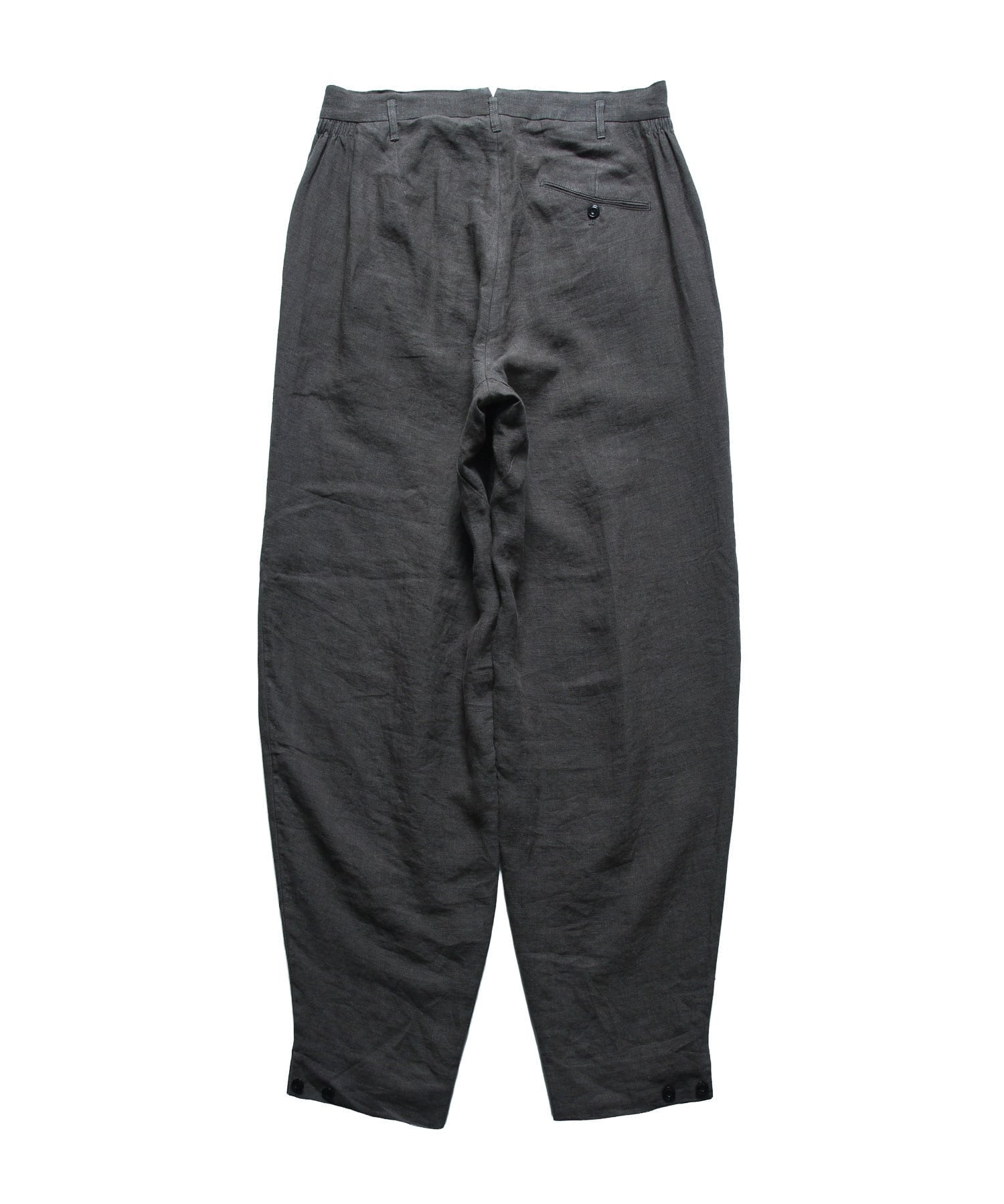 長年愛用している40年代のフランス製ワークトラウザーズへの深い愛着から生まれた1着です。特にサイドの脇部分に施されたギャザーによって生み出される、太く丸い落ち感が特徴的です。